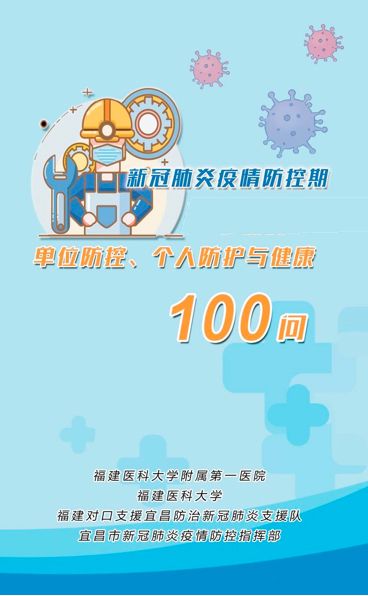 新冠肺炎疫情发生以来,湖北人民积极响应号召,同时间赛跑,与病魔较量,以实际行动为打赢疫情防控人民战争、总体战、阻击战贡献了重要力量。为进一步加强疫情防护健康教育,引导大众正确认识、科学防护、理性应对,福建援宜支援队依托福建医科大学附属第一医院、福建医科大学,组织编写了《新冠肺炎疫情防控期单位防控、个人防护与健康100问》,涉及个人防护、重点场所防护、心理与营养支持、返岗复工注意事项、法律法规等,旨在对社会关注度较高的疫情防控知识进行解答。
