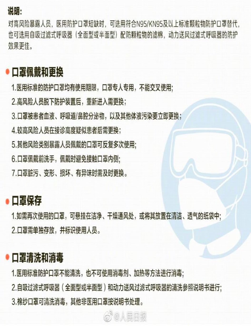 (1) 全程正确佩戴口罩,最好备两副口罩,一旦口罩变湿、脏污和变形,需及时更换。