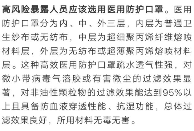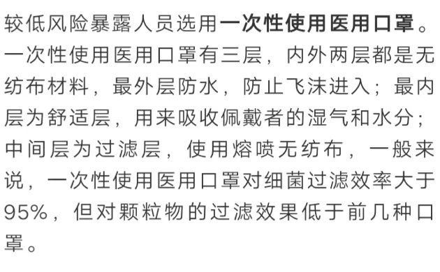 低风险暴露人员可不佩戴口罩,或者佩戴非医用口罩,如棉纱、活性炭和海绵等口罩。这类口罩防护过滤效率低,但也有降低咳嗽、喷嚏和说话等产生的飞沫播散的作用。