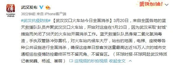 3月20日,来自全国各地的蓝天救援队队员齐聚武汉汉口火车站,开始对这座在1月23日,因为武汉采取“封城”措施而关闭了58天的火车站开展消杀工作。
