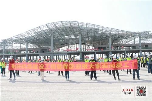“看!航站区作业已全面开始。”荆州机场建设管理有限公司党委副书记、总经理李海军,指着钢构已基本封顶的航站楼说:“经过严格的防疫复工准备,复工首日,员工返岗108人,机械设备到位47台。航站楼二次结构、供水站泵房、货运站、女儿墙和供油站基础施工都已启动。”