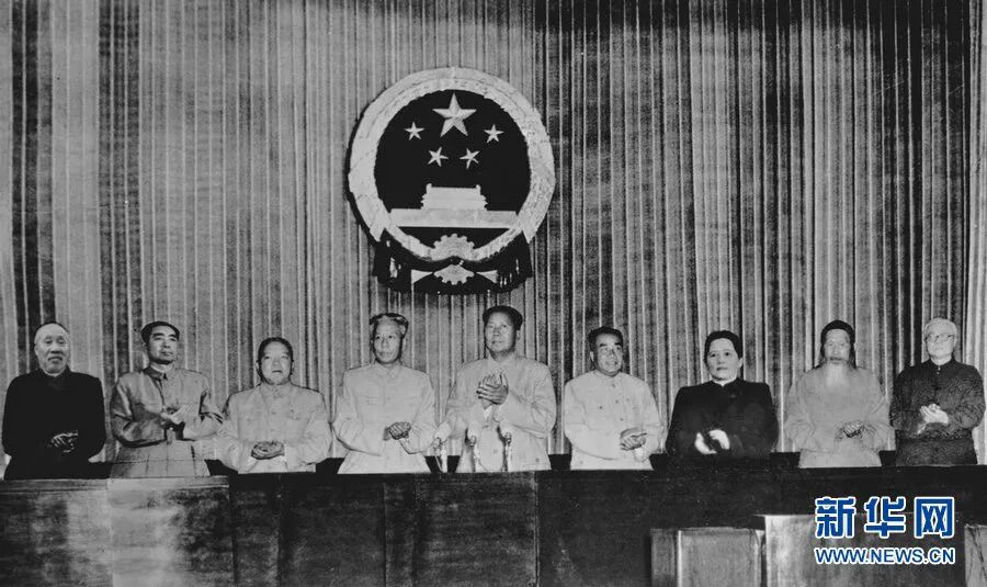 1954年9月15日,中华人民共和国第一届全国人民代表大会第一次会议在北京怀仁堂开幕。左起:董必武、周恩来、李济深、刘少奇、毛泽东、朱德、宋庆龄、张澜、林伯渠。(资料照片)图片来源:新华网