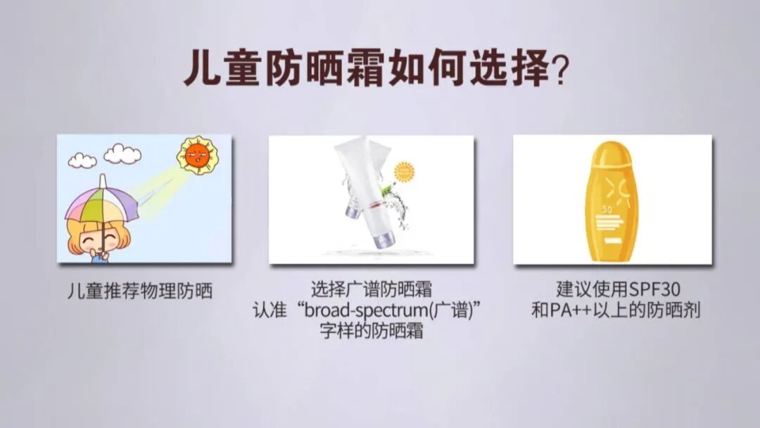 建议6个月以上的宝宝才可以涂抹防晒霜,6个月以下宝宝只能靠“躲”和“遮”的方式来防晒。儿童推荐物理防晒,选择广谱防晒霜 认准“broad-spectrum(广谱)”字样的防晒霜。可以同时抵御UVB(长波紫外线)和UVA(短波紫外线)这两种对人体有害的紫外线。使用SPF30和PA++以上的防晒剂。