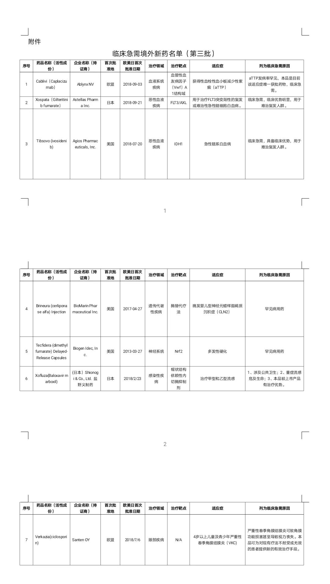 10月29日,国家药监局药审中心发布关于第三批临床急需境外新药的公示,内容如下。