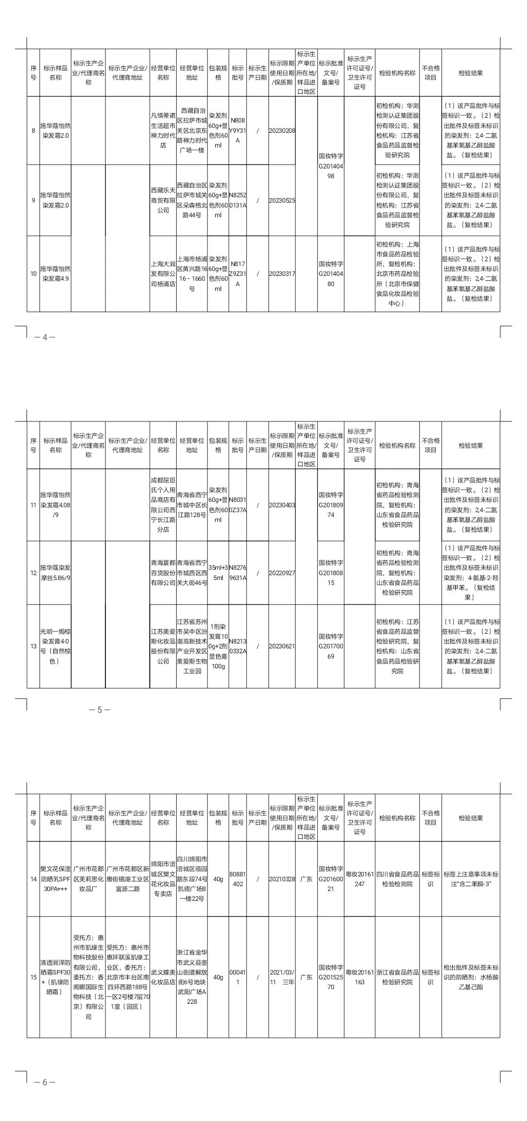 在2020年国家化妆品监督抽检工作中,经云南省食品药品监督检验研究院等单位检验,标示为肇庆市凯捷科技有限公司等生产的凯捷染发膏(橙色)等10批次染发类产品,广州瑞宸生物科技有限公司生产的丽兰美姬水能量补水面膜等3批次面膜类产品,广州市花都区芙莉思化妆品等生产的樊文花保湿防晒乳SPF30PA+++等2批次防晒类产品,广州市天之鸿化妆品有限公司等生产的5批次烫发/脱毛类产品不合格(见附件)。