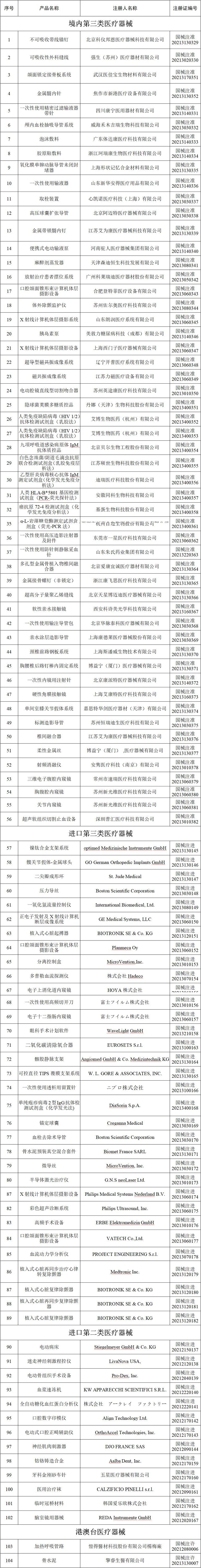 2021年5月,国家药品监督管理局共批准注册医疗器械产品104个。其中,境内第三类医疗器械产品56个,进口第三类医疗器械产品33个,进口第二类医疗器械产品13个,港澳台医疗器械产品2个(具体产品见附件)。